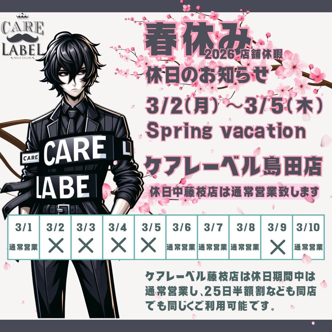 春休みのお知らせ 3月ケアレーベル島田店お休みは2〜5日が春休みとして休業致します(藤枝店は営業) |